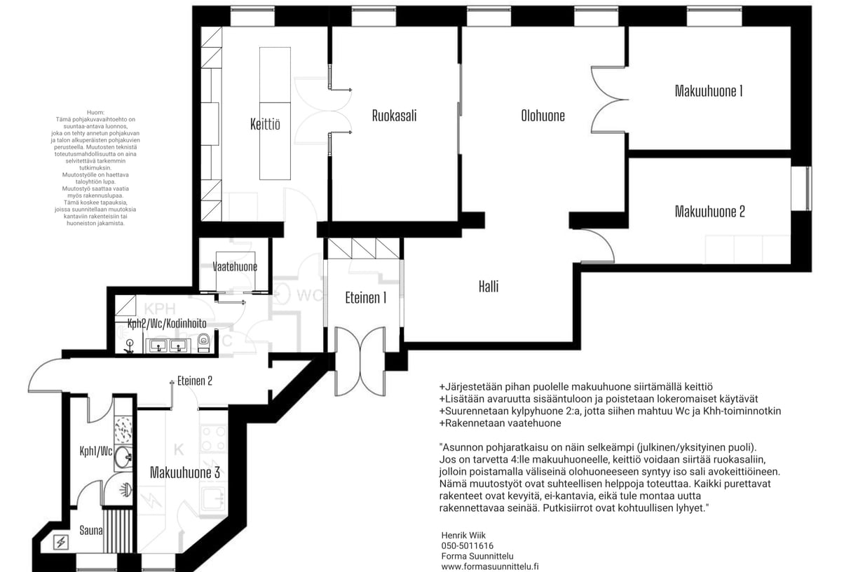 Muutosehdotukset perustuvat annettuun pohjakuvaan ja talon vanhoihin piirustuksiin. Remontteihin täytyy aina saada taloyhtiön lupa.