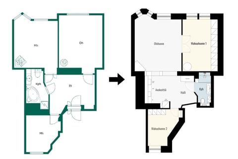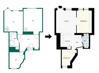 Suunnittelemme asunnolle vaihto-ehtoisen pohjaratkaisun, jossa tilat on optimoitu nykypäivän vaatimustasoa vastaaviksi. Pohjapiirustuksesta näkee mitä muutoksia asuntoon voi tehdä.